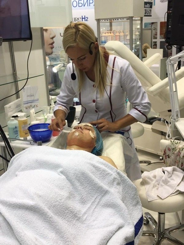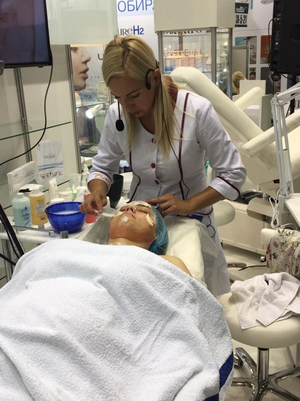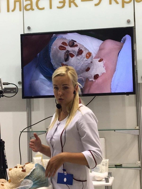 Елена Назарук, косметолог с медицинским образованием, методист учебного центра «Пластэк-Украина», продемонстрировала на стенде программы по уходу за лицом и телом от французской марки Les Сomplexes Biotechniques M120: провела процедуру холистической гуаза-терапии лица, представила процедуру для лица от французской органической линии LCbio, рассказала об уникальной методике «Ионитермия» для коррекции фигуры и провела мастер-класс по технике «Пластитермия».